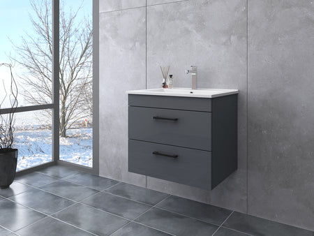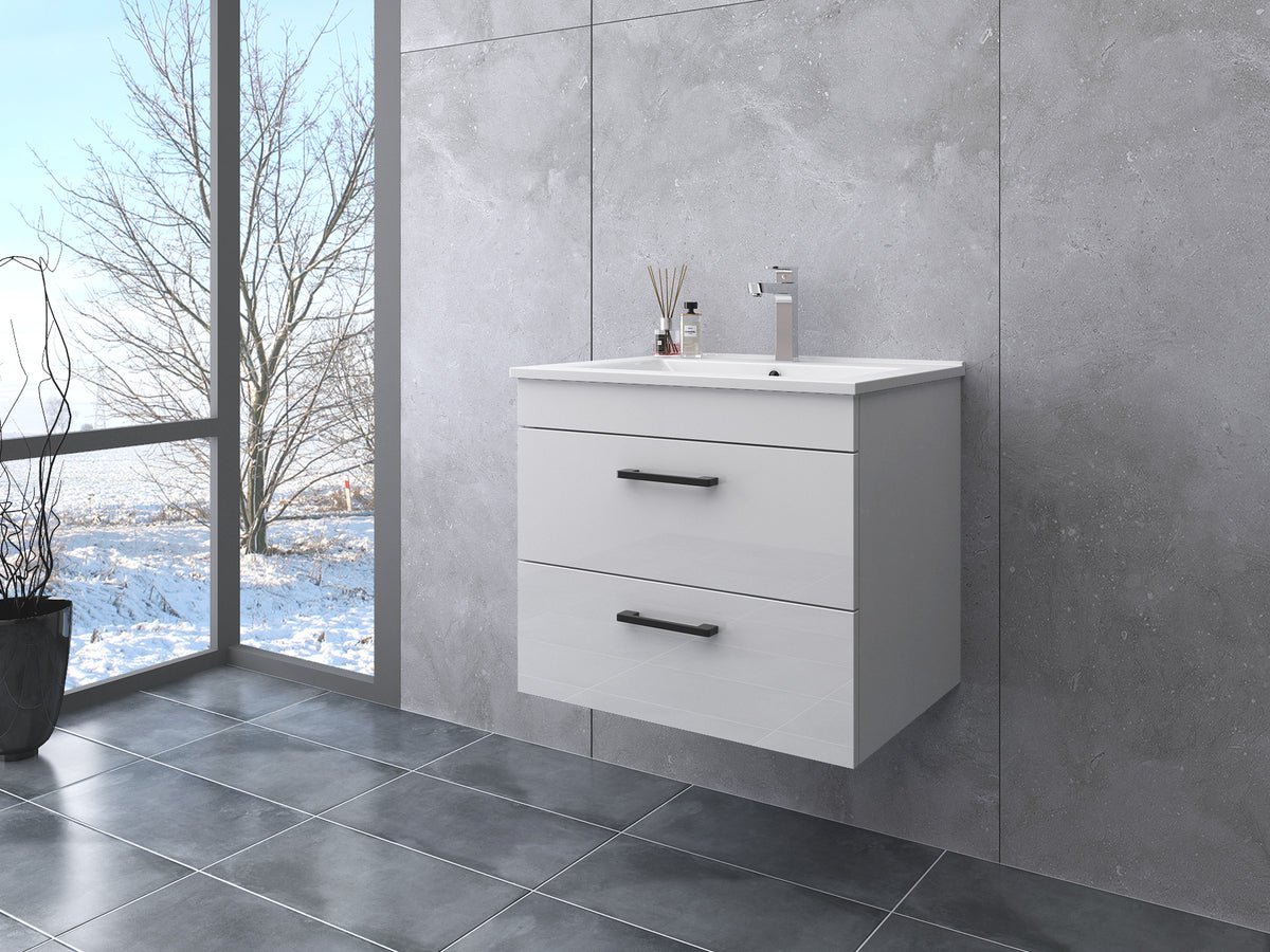 The vanity features two smooth-gliding drawers fitted with two modern handles, offering convenient and organised storage. Its easy-clean surface ensures minimal maintenance, making it perfect for busy households. Available in Grey Gloss and White Gloss, the unit is designed to match seamlessly with the full Bellatrix Gloss furniture range for a coordinated bathroom look.