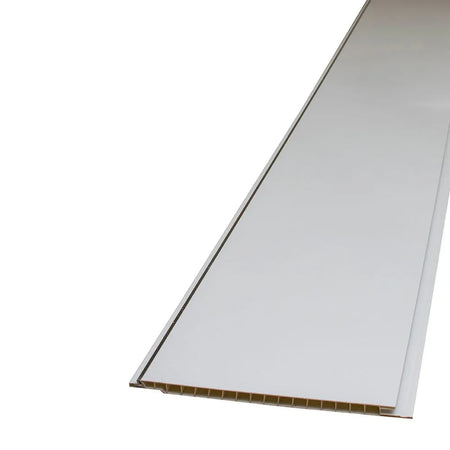 Gloss White with Chrome Strip ceiling panels from the Decorceil range is a contemporary, time-saving alternative to plastering. The chrome strip runs vertically along the length of each panel adding character and the high gloss finish keeps the panels looking clean and fresh. This PVC cladding is ideal for your bathroom or kitchen but can be used in any room you wish.
