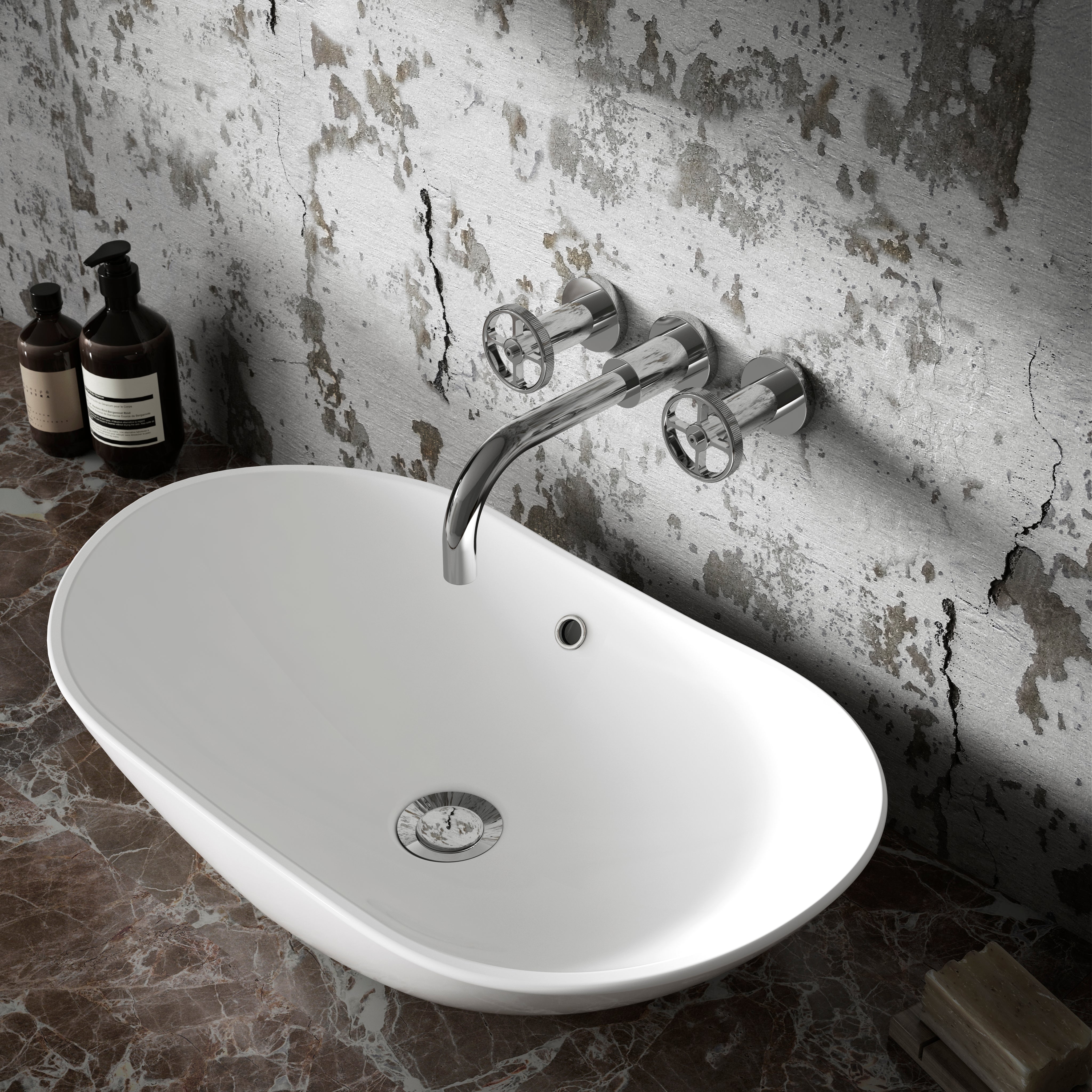 - Industrial style wall mounted basin mixer giving a unique design