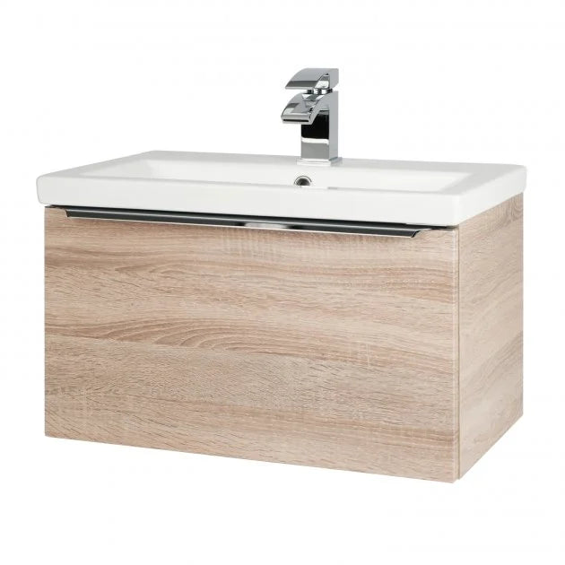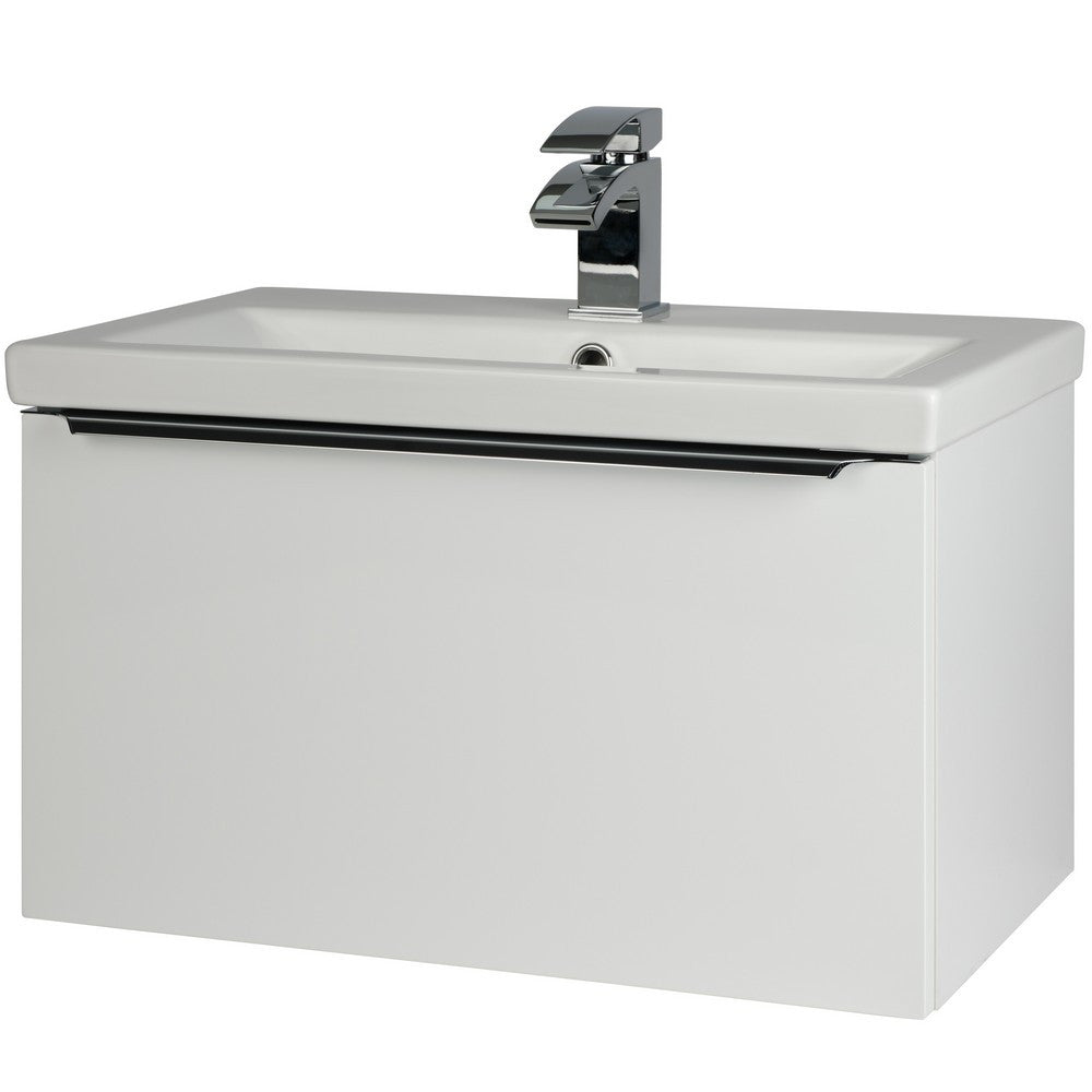 With its squared design, this unit incorporates premium soft-close technology and a generously proportioned metal drawer box, ensuring abundant storage space. The ceramic basin, also finished in matching gloss white, features a single tap hole for added convenience.