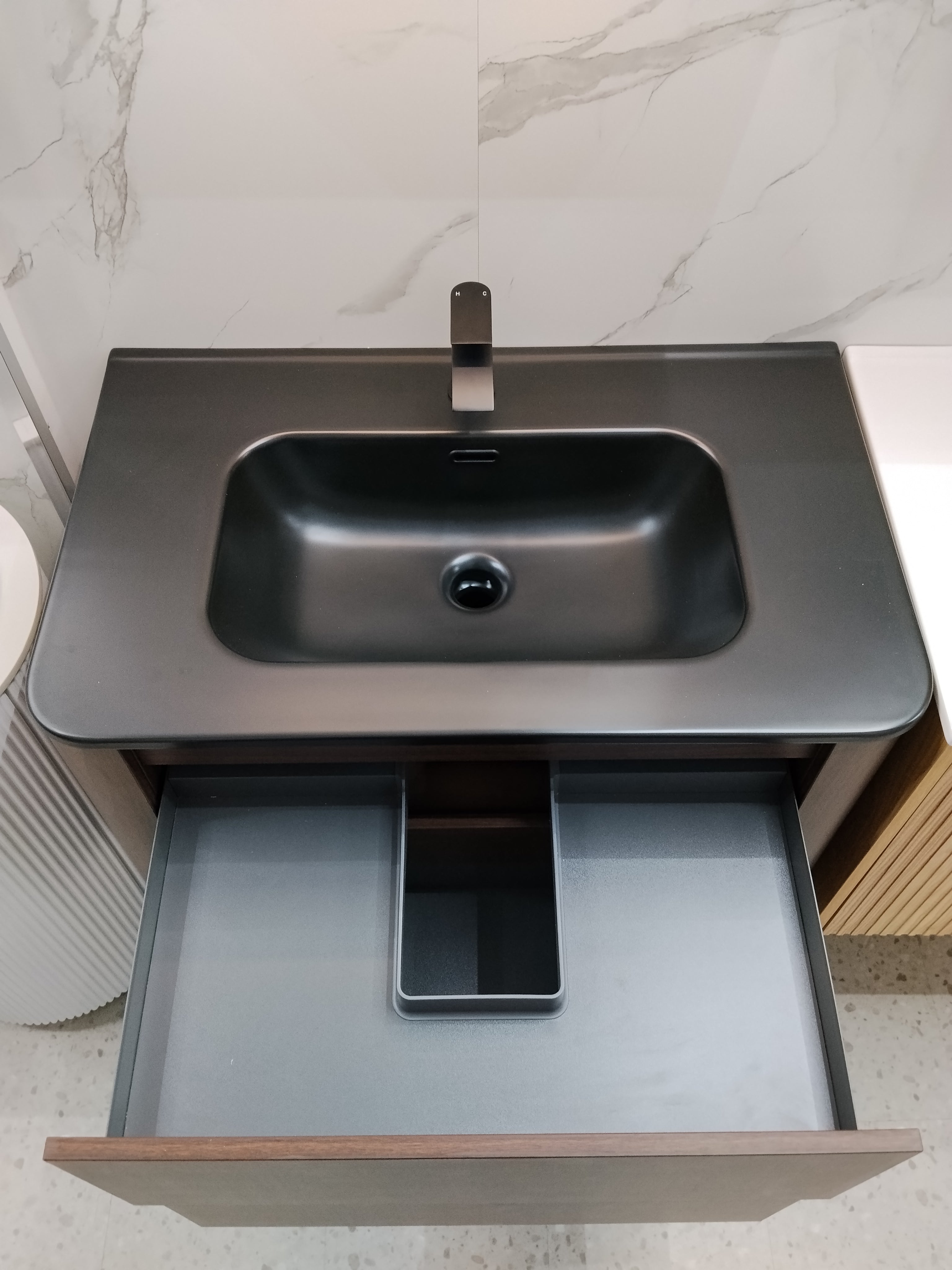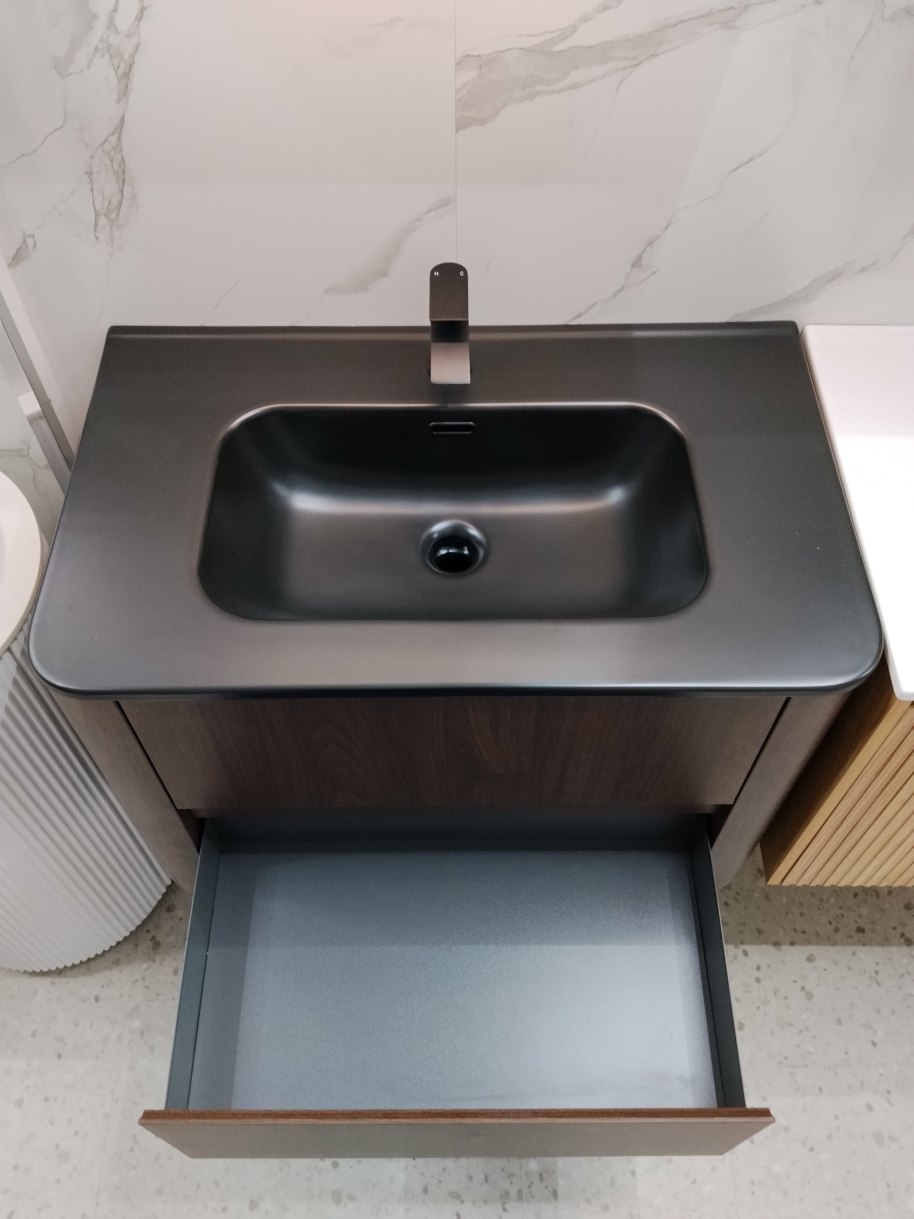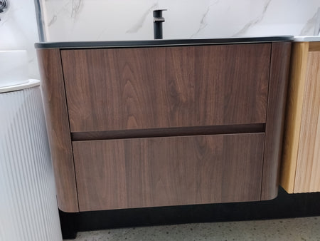 Supplied complete with a stylish Timbera 750 matt black ceramic above-counter basin, the contrast between the dark basin and walnut finish delivers a bold, premium appearance. The countertop and basin are perfectly matched to create a cohesive and refined vanity solution.